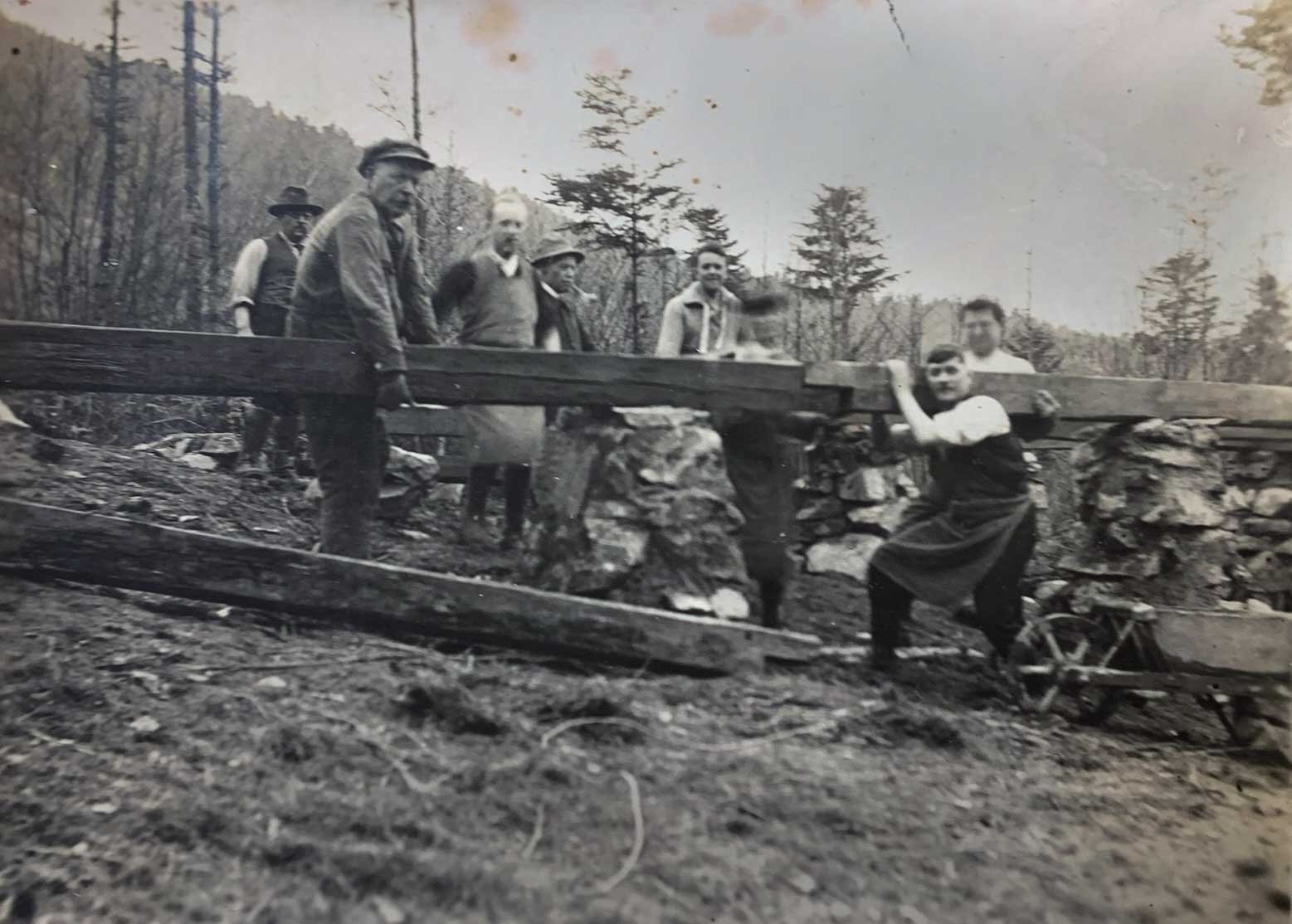 Le 12 mars, ils démontent la baraque. Le 31 mars, livraison des planches et des lattes. Du 6 au 14 avril 1928, ils construisent avec l’entreprise Aloyse Frei, maître-charpentier de Lutzelhouse. Sur les photos d’archive, on voit les peintres donner « de sérieux coups de main » : creuser les fondations, tailler les pierres trouvées sur place, assembler les murs. Coût total : 6348 francs. Le premier chalet est debout.